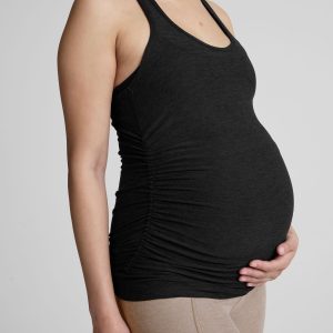 Meet your new favorite maternity tank. Mama. This classic racerback maternity tank silhouette is made from a lighter version of our deliciously soft Spacedye fabric. A classic scoop neckline and a sporty design give it an everyday ease you can wear with anything in one active maternity top. Ruched seams allow for ample stretch to always fit in every stage of pregnancy. even into 4th trimester.