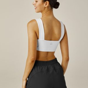 Go from barre to boardwalk in this cute square bra top. with modern square neckline and medium support. Pair with matching high waisted leggings for class. or wear over high waisted active skirts or bikers for rollerskating out in Venice.