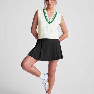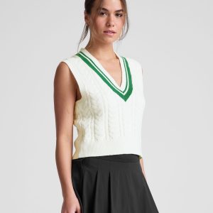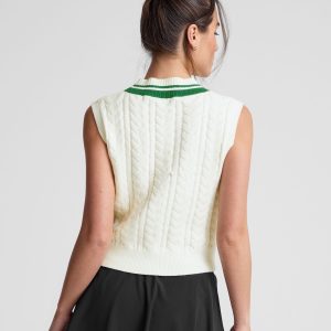 East coast prep meets west coast cool in our new sleeveless vest. With a unique knit pattern. contrast stripe V-neckline for a clean look. and waist length that pairs with any style short. skirt or pant.